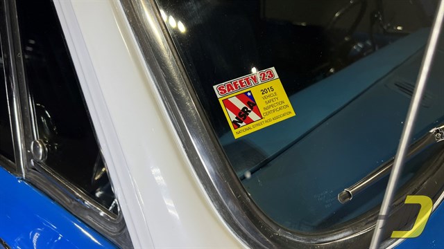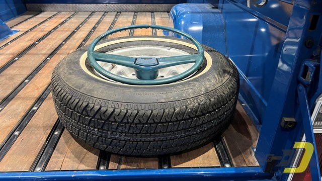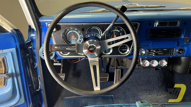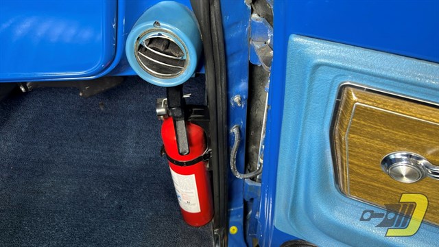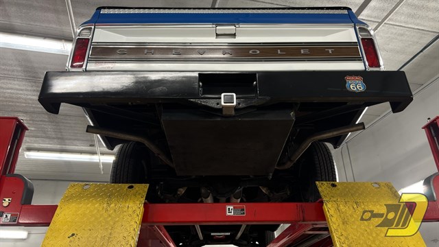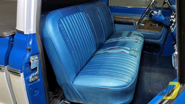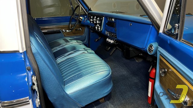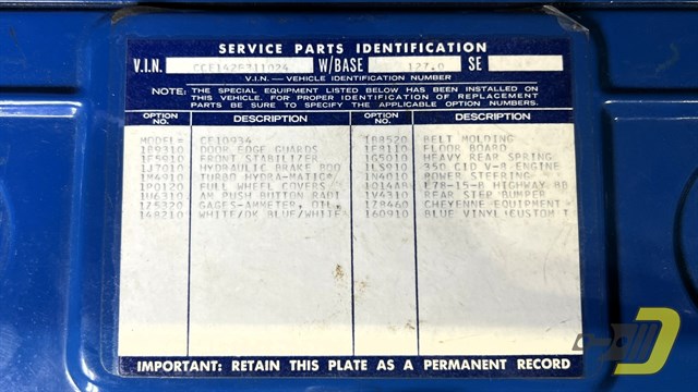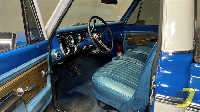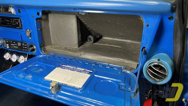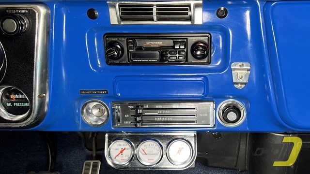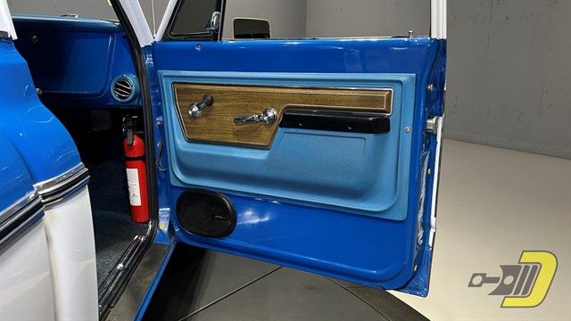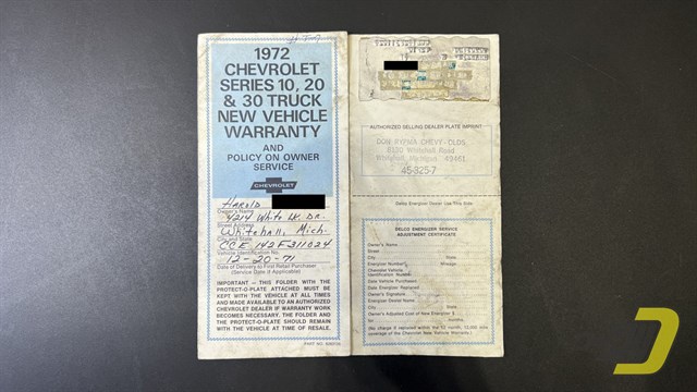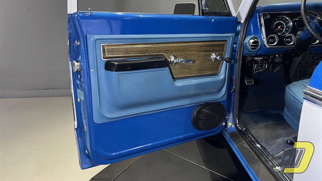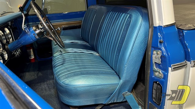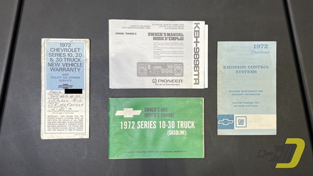 The blue interior is centered around the recovered bench seat with belts for three occupants. The door panels look sharp with the Cheyenne woodgrain inserts while the dashboard is classic Chevrolet. An aftermarket gauge set has been installed and an old CB handset bracket remains on the dashboard. All lights and signals work properly as do the horn, wipers, washers, heater, and defroster. The R134a air conditioning blows cold and received a new compressor in 2024. An aftermarket steering wheel is present along with a Pioneer stereo. Finally, the original manual and warranty book with Protect-O-Plate are included.
