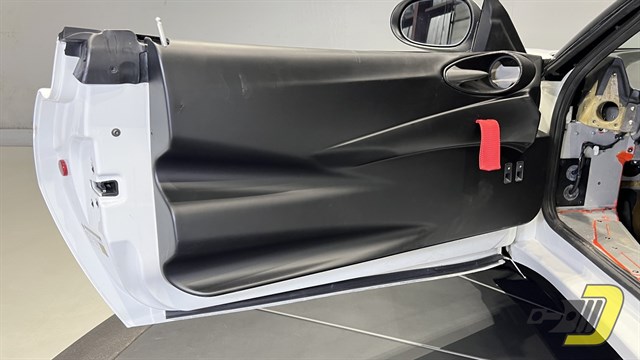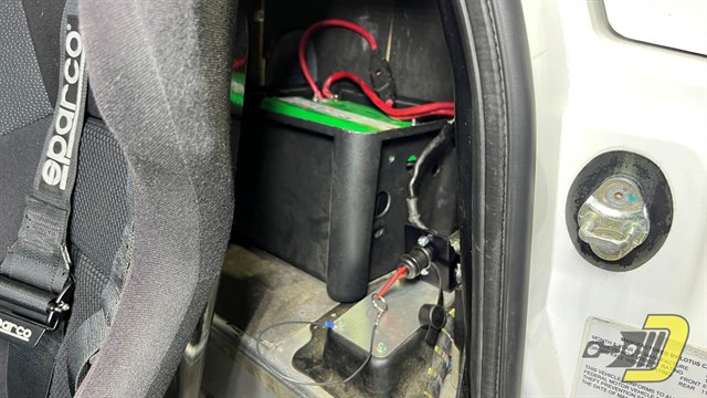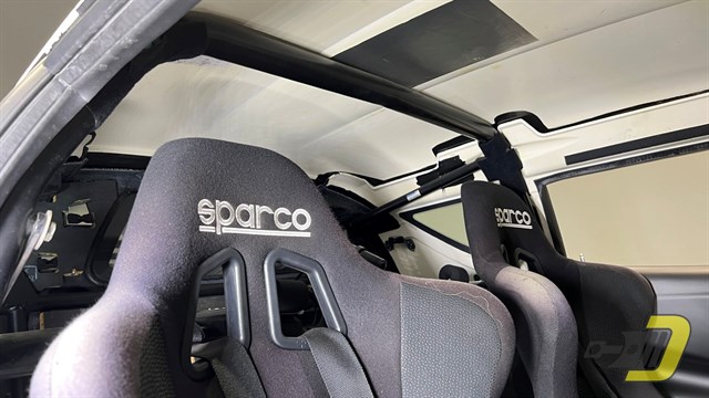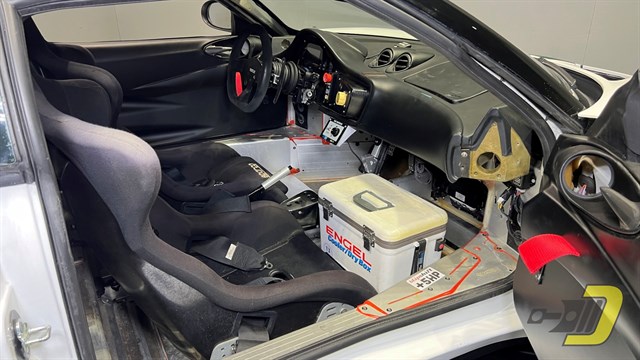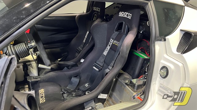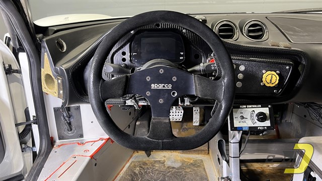 The interior is now void of carpet, power windows, and other non-essential items. The seats were replaced with Sparco pieces with 5-point harnesses. A full AIM instrumentation system was installed along with a detachable steering wheel and cool suit box. Other race items include a roll bar and a fire suppression system. A Tilton brake balancer is also present.
