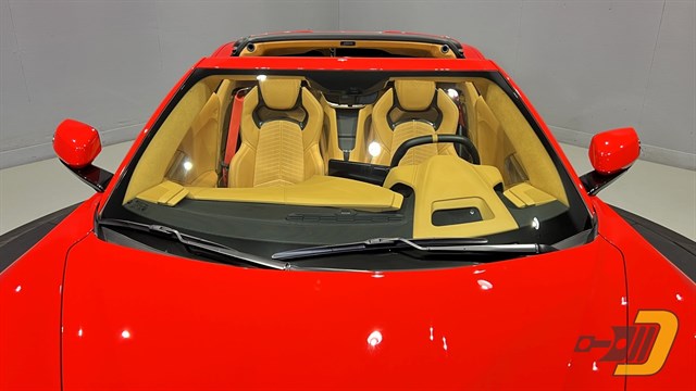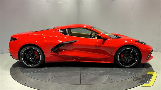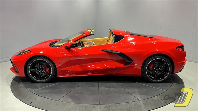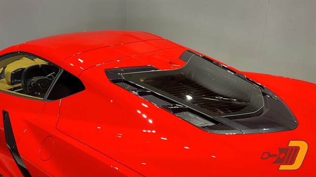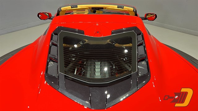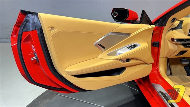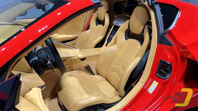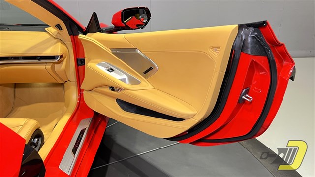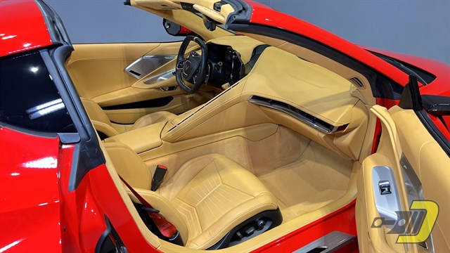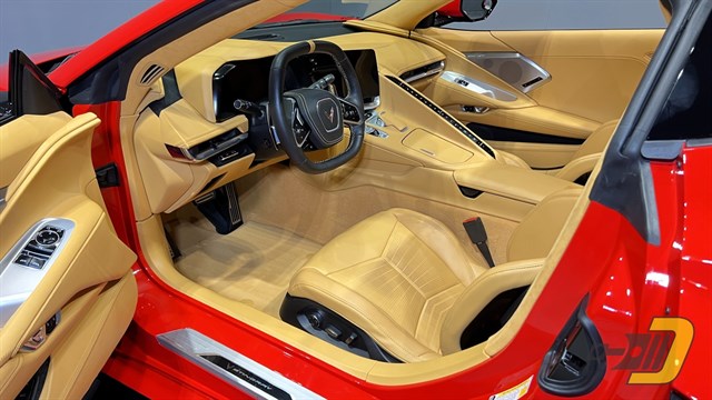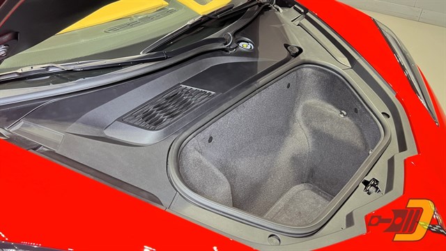 This Corvette is a 1-owner car with 2,700 miles and a spotless history. It is in mint condition throughout as expected from a car with such low miles. The Torch Red paint cannot be missed, especially with all the angles and creases that define the C8 shape. As with previous Corvettes, the roof panel is easily removed and stored in back for spontaneous open-air motoring. This example also has the optional carbon flash painted aluminum wheels (19” front, 20” rear) and painted red calipers.